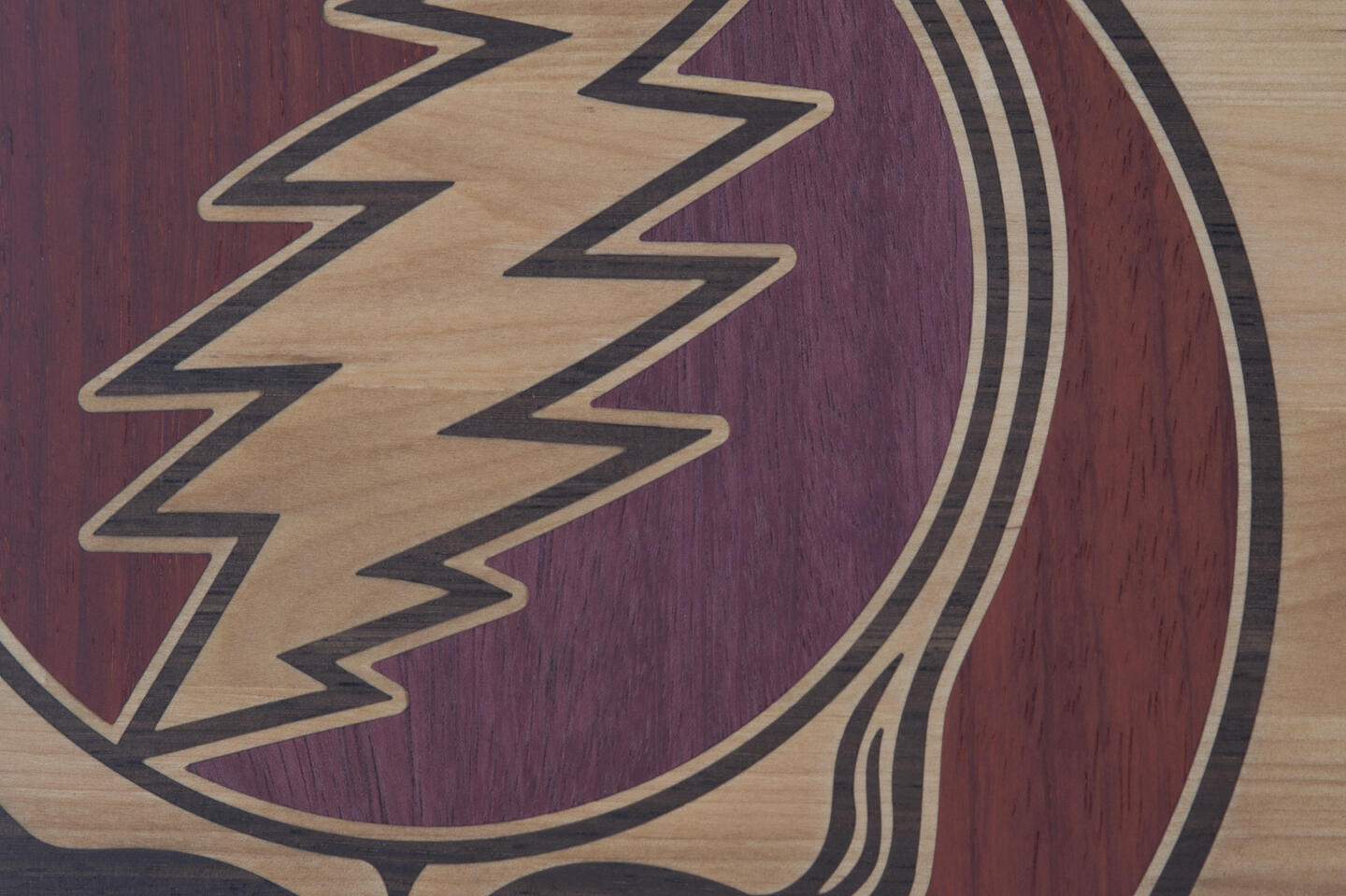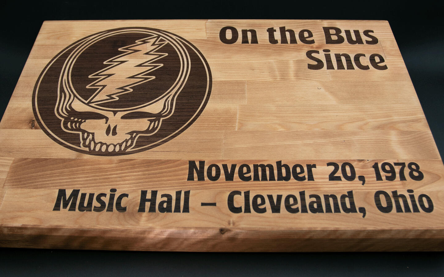 Custom hardwood inlay cutting boards with Dad's first show & location, handmade in Colorado.